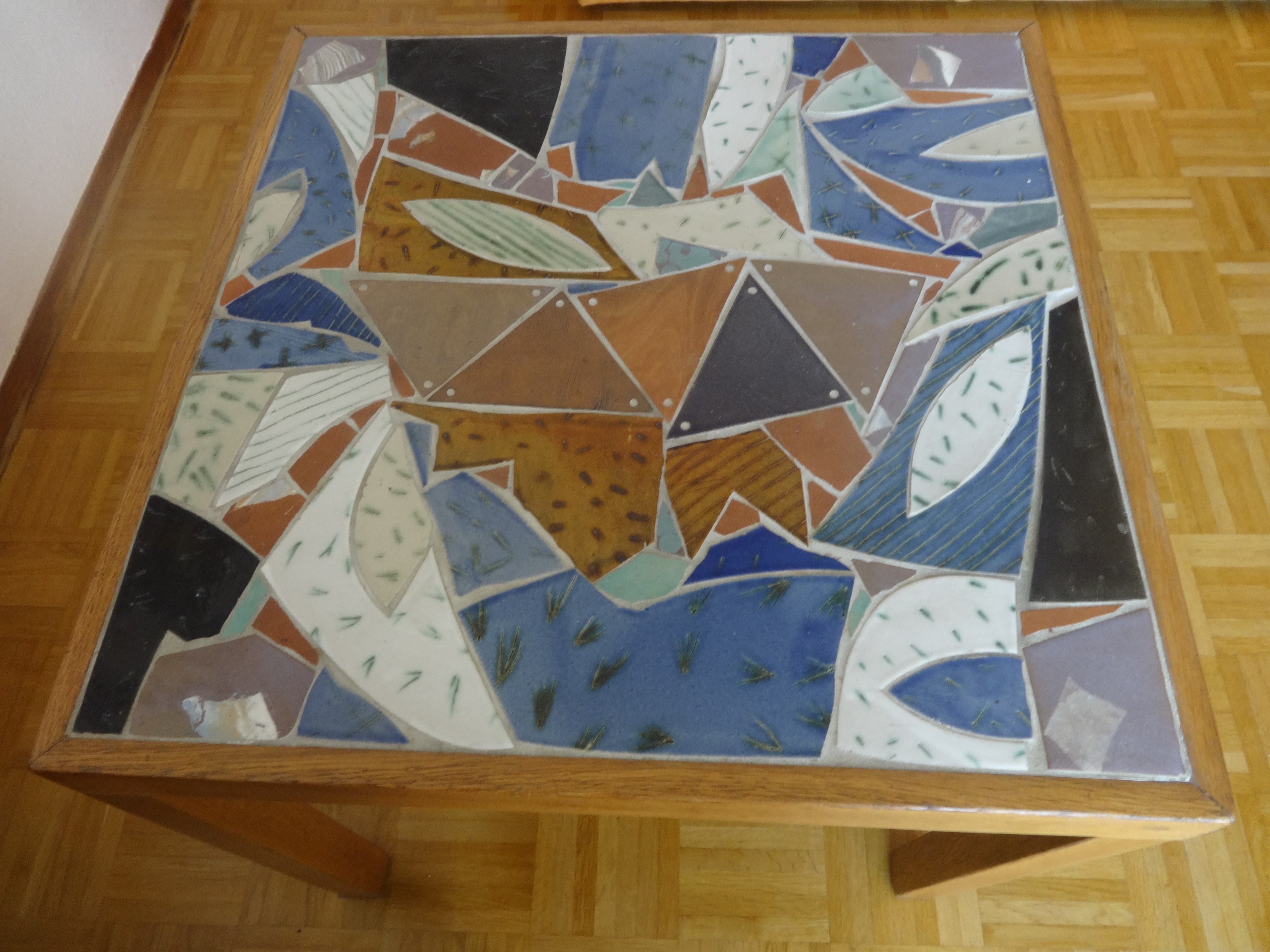 Ich stelle meinen Kaffeebecher auf den Tisch. Endlich Pause. In Gedanken schaue ich mir den Tisch an. Die einzelnen Fugen und die unterschiedlichen Fliesen: blau, braun, terrakotta, weiß mit grünen Strichen, aber auch schwarz. Der Tisch hat Geschichte. Mein Großvater hat ihn getischlert. Die Beine sind ein wenig zu dünn für die dicke Platte. Mein Großvater war Bootsbauer, nicht Tischler.